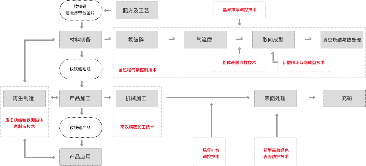公司經(jīng)過多年的技術(shù)創(chuàng)新,形成了涵蓋磁體制備、機械加工、表面防護(hù)和再生制造等多個方面的燒結(jié)釹鐵硼磁體生產(chǎn)全過程核心技術(shù)體系。通過上述核心技術(shù),實現(xiàn)提高產(chǎn)品磁性能和服役特性、節(jié)約資源和成本等效果。