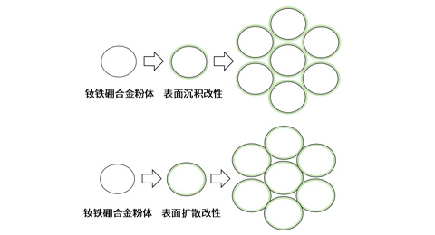 公司創(chuàng)新開發(fā)出多種釹鐵硼合金粉體表面改性技術(shù):包括物理氣相沉積重稀土金屬膜層技術(shù)、粉體表面擴散改性技術(shù)、化學(xué)合成膜改性技術(shù)等。通過粉體表面改性,改善了粉體的流動性和抗氧化性,提高了粉體表層的各向異性場,最終提高了材料的矯頑力。