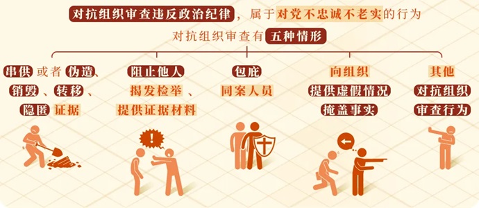《中國共產(chǎn)黨紀律處分條例》第六十三條規(guī)定了對抗組織審查,應予處分的五種情形:串供或者偽造、銷毀、轉(zhuǎn)移、隱匿證據(jù);阻止他人揭發(fā)檢舉、提供證據(jù)材料;包庇同案人員;向組織提供虛假情況,掩蓋事實;其他對抗組織審查行為。