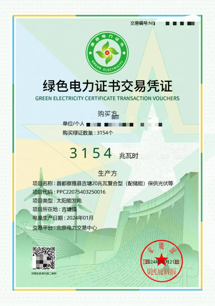 綠色電力證書(shū)交易憑證。