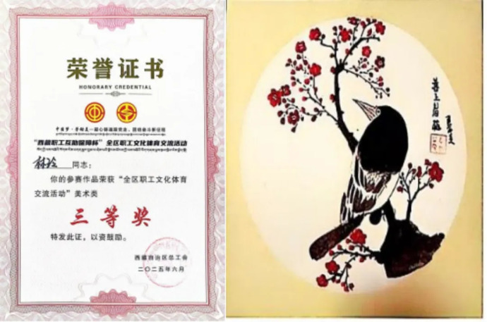 在此次活動中,集團廣大干部職工積極響應,圍繞活動主題,緊密聯(lián)系工作和生活實際,展現(xiàn)了干部職工們的風采和活力。林玲憑借其精湛的繪畫技藝、豐富的想象力和對此次活動主題的深刻理解,以一幅國畫《喜上眉梢》在眾多參賽作品中脫穎而出,為集團贏得了榮譽。喜鵲象征吉祥,梅花寓意堅韌,寄托著對西藏自治區(qū)成立60周年、中華全國總工會成立100周年的祝福和對祖國更加繁榮昌盛的美好祝愿。