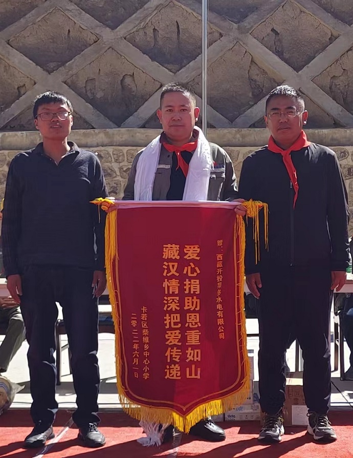 果多水電公司代表張二林同志作了題為“祖國的未來,民族的希望”的講話,并代表果多水電公司給學(xué)校捐贈了學(xué)習(xí)用品,足球、排球、羽毛球等,勉勵(lì)孩子們要樹立遠(yuǎn)大理想,努力學(xué)習(xí),健康成長,以優(yōu)異的成績回報(bào)社會、回報(bào)祖國。柴維鄉(xiāng)小學(xué)贈送了“愛心捐助恩重如山,藏漢情深把愛傳遞”的錦旗,感謝果多水電公司對學(xué)校的關(guān)心支持幫助。