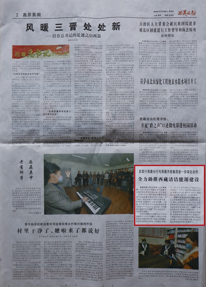 (編者按)《西藏日報》2022年5月26日在第2版“高原要聞”欄目刊登文章,報道集團(tuán)公司與農(nóng)發(fā)行西藏分行銀企攜手全力助推西藏清潔能源建設(shè)。全文如下: