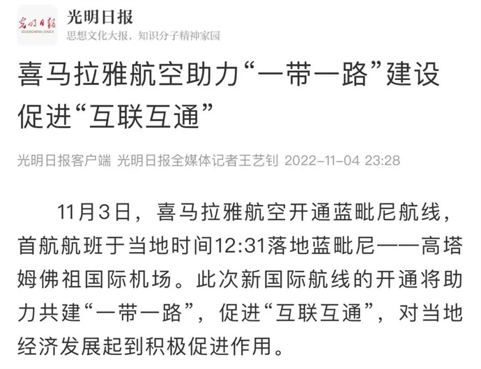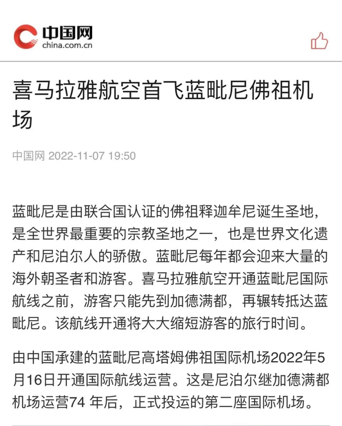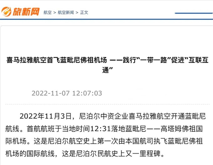 中華網(wǎng)、中國網(wǎng)、中企網(wǎng)、中國日報、光明日報、中國旅游新聞網(wǎng)、中國西藏新聞網(wǎng)、拉薩新聞網(wǎng)等媒體報道喜航開通加德滿都至藍毗尼航線