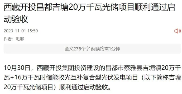 人民網(wǎng)、中國(guó)西藏新聞網(wǎng)、西藏日?qǐng)?bào)客戶(hù)端報(bào)道了《西藏開(kāi)投昌都吉塘20萬(wàn)千瓦光儲(chǔ)項(xiàng)目順利通過(guò)啟動(dòng)驗(yàn)收》
