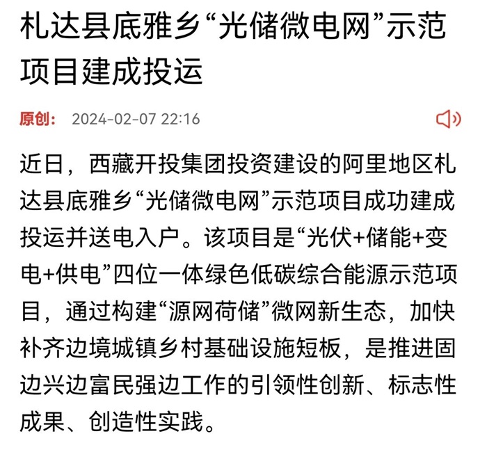 編者按:2月7日,西藏日報發(fā)表《札達縣底雅鄉(xiāng)“光儲微電網”示范項目建成投運》文章。全文如下: