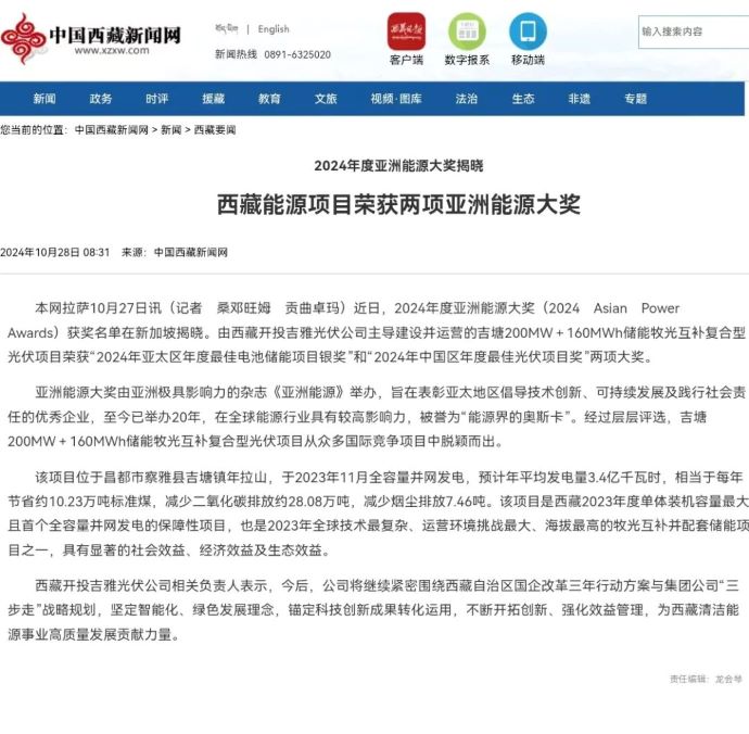 編者按:近日,中國科技網(wǎng)、科技日?qǐng)?bào)、西藏日?qǐng)?bào)、西藏發(fā)布、中國西藏新聞網(wǎng)、西藏商報(bào)、昌都發(fā)布等多家媒體集中宣傳報(bào)道了西藏開投吉雅光伏公司榮獲兩項(xiàng)亞洲能源大獎(jiǎng)相關(guān)事宜。摘要如下: