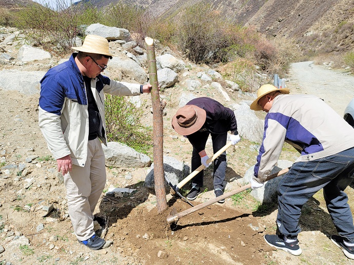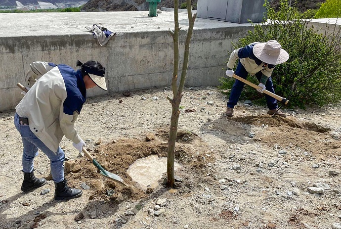 在燦爛的陽光下,挖坑、扶苗、填土、踩實、圍堰、澆水……嘎堆水電公司全體干部職工個個干練嫻熟。雖然開挖和取水都非常困難,但大家仍然熱情高漲,干勁十足,配合默契,共同播下今年的綠色心愿。