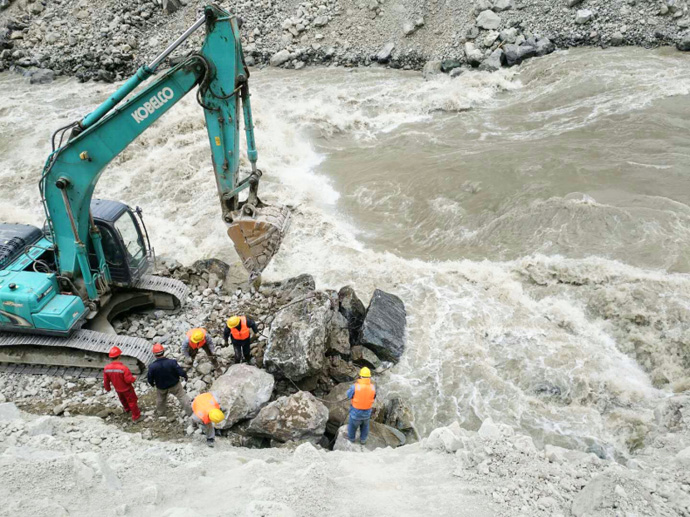 7月4日受持續(xù)強(qiáng)降雨影響,易貢藏布河水暴漲,7月5日凌晨5時(shí),金橋水電站壩前水位達(dá)到3412.86米,施工區(qū)水流量達(dá)到647 m3/s。24小時(shí)后,壩前水位3412.03米,已建成的右岸壩段及在建的左岸壩段因?yàn)橘|(zhì)量把控到位、施工組織及防洪措施到位,經(jīng)受住了洪水的考驗(yàn);但是從嘉黎縣至金橋水電站施工現(xiàn)場(chǎng)的100公里公路有19處路段出現(xiàn)不同程度損毀,其中3處路段完全中斷,沖毀路段約5公里,路基、堡坎垮塌約2公里,金橋水電站主要建材物資暫時(shí)停運(yùn),尼屋鄉(xiāng)2000余村民出行受阻,存在極大安全隱患,嚴(yán)重影響了受災(zāi)群眾的生產(chǎn)生活。