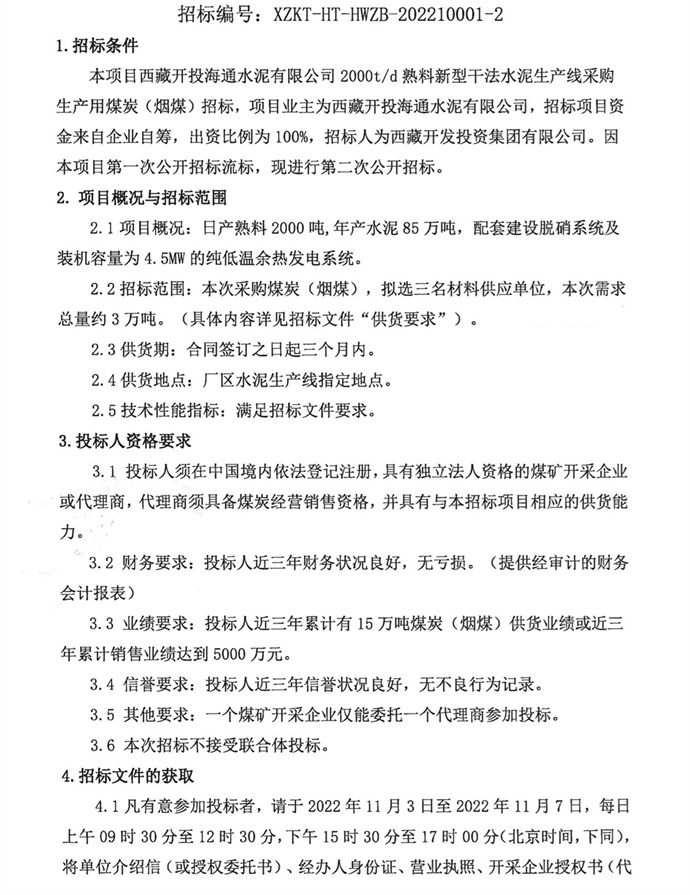 采購(gòu)生產(chǎn)用煤炭(煙煤)二次招標(biāo)公告