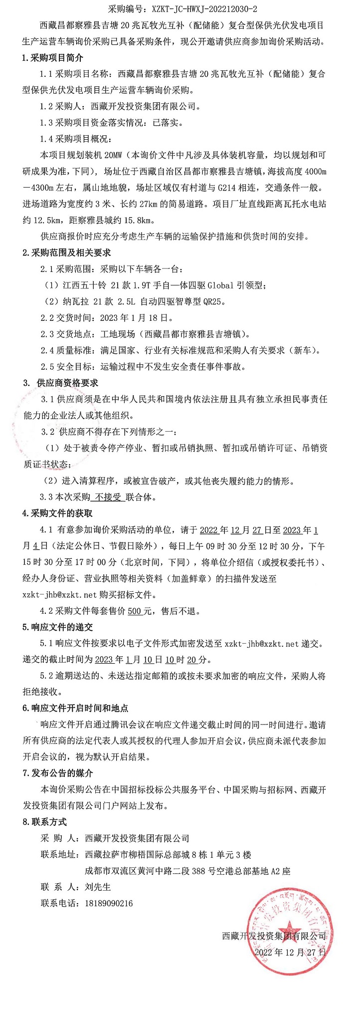 西藏昌都察雅縣吉塘20兆瓦牧光互補(配儲能)復(fù)合型保供光伏發(fā)電項目生產(chǎn)運營車輛詢價采購二次公告