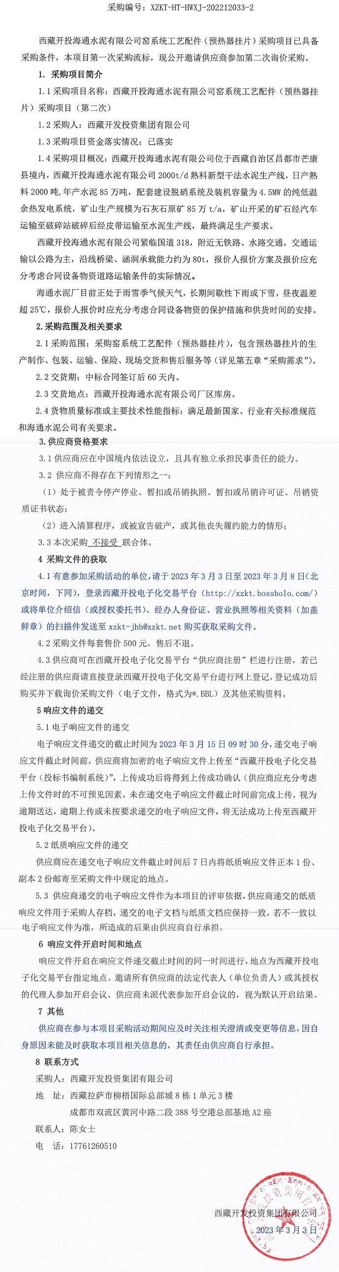 西藏開(kāi)投海通水泥有限公司窯系統(tǒng)工藝配件(預(yù)熱器掛片)采購(gòu)項(xiàng)目(第二次)詢價(jià)采購(gòu)公告
