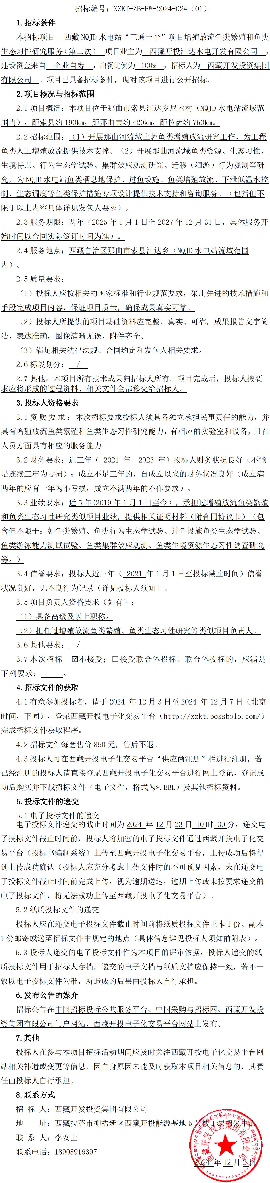 西藏 NQJD 水電站“三通一平”項目增殖放流魚類繁殖和魚類生態(tài)習(xí)性研究服務(wù)(第二次)招標公告