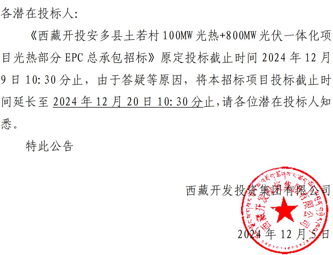 關(guān)于延長(zhǎng)《西藏開投安多縣土碩 100MW 光熱+800MW 光伏一體化項(xiàng)目光熱部分 EPC 總承包招標(biāo)》投標(biāo)截止時(shí)間的公告